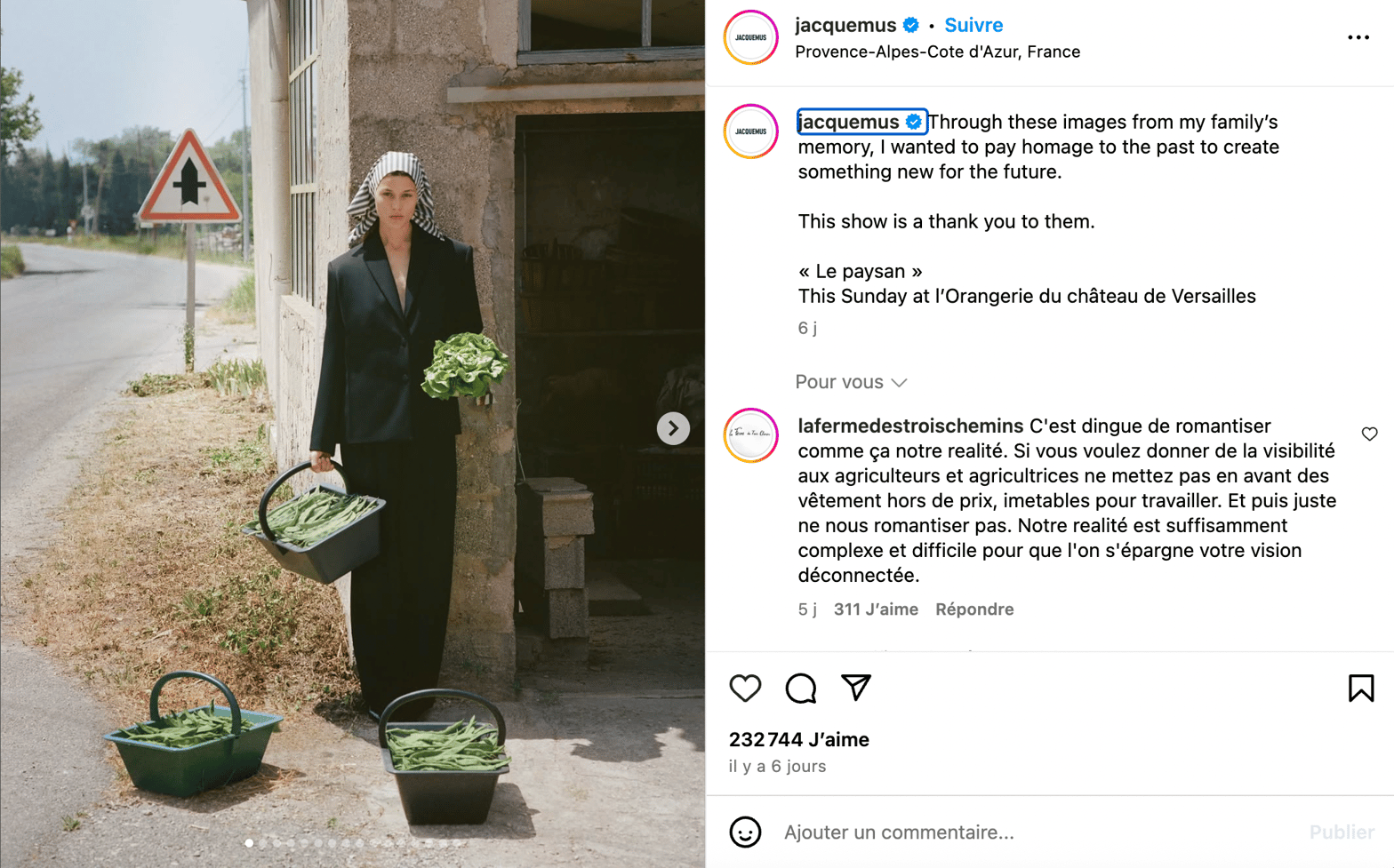 Le post est viral, et le milieu de la mode salue l'hommage poétique aux racines et à la famille de Jacquemus.