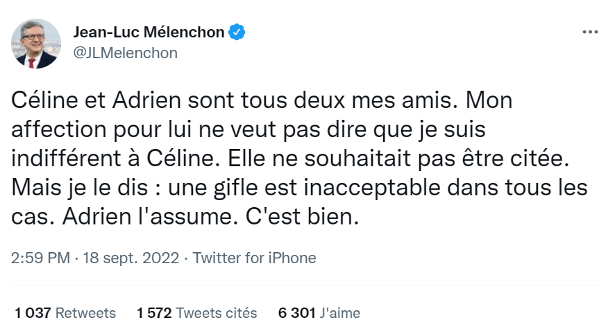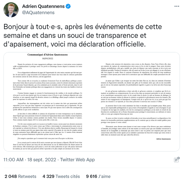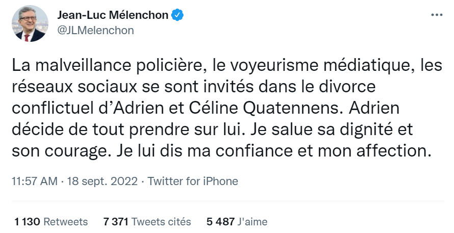 « La malveillance policière, le voyeurisme médiatique, les réseaux sociaux se sont invités dans le divorce conflictuel d’Adrien et Céline Quatennens. Adrien décide de tout prendre sur lui. Je salue sa dignité et son courage. Je lui dis ma confiance et mon affection. »