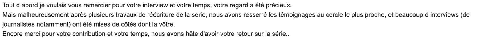 Entre 2022 et 2025, à la demande de Netflix, d’autres co-réalisateurs·ices ont remplacé Karine et Zoé. Je l’ai appris deux jours avant la diffusion du documentaire (mars 2025), par un mail d’un co-réalisateur qui m’annonçait à ce titre que je ne serais pas retenue au montage.
